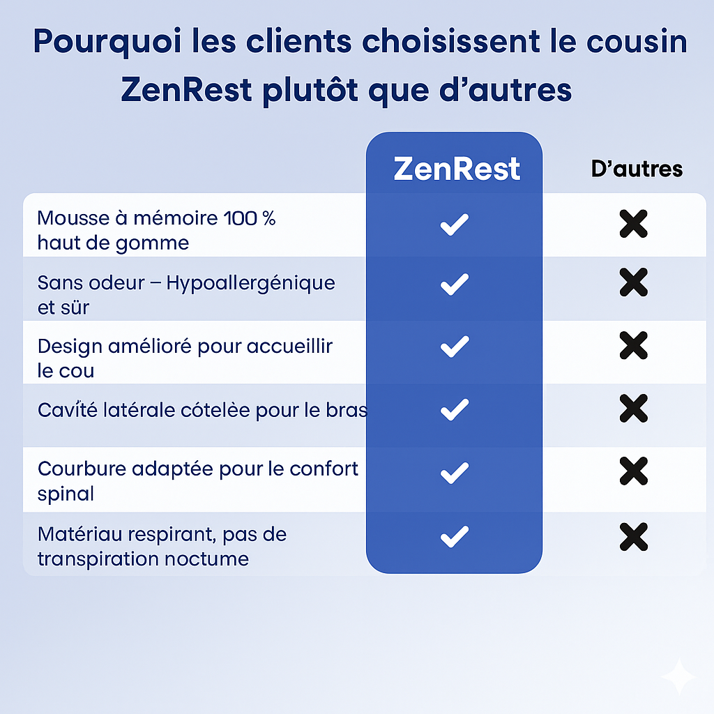 ZenRest™, l’oreiller qui change vos nuits : mousse à mémoire haut de gamme, housse respirante et soutien parfait pour la tête, la nuque et les épaules. Fini la chaleur, les allergies et les oreillers qui s’affaissent — place à un sommeil profond et des réveils légers.